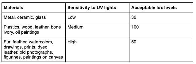 Seperti disebutkan sebelumnya, Anda harus memilih lampu dengan sinar UV minimal. Faktor penting lain yang perlu diingat saat mendesain lingkungan pencahayaan adalah durasi paparan cahaya pada artefak. Durasi ini harus diminimalkan.